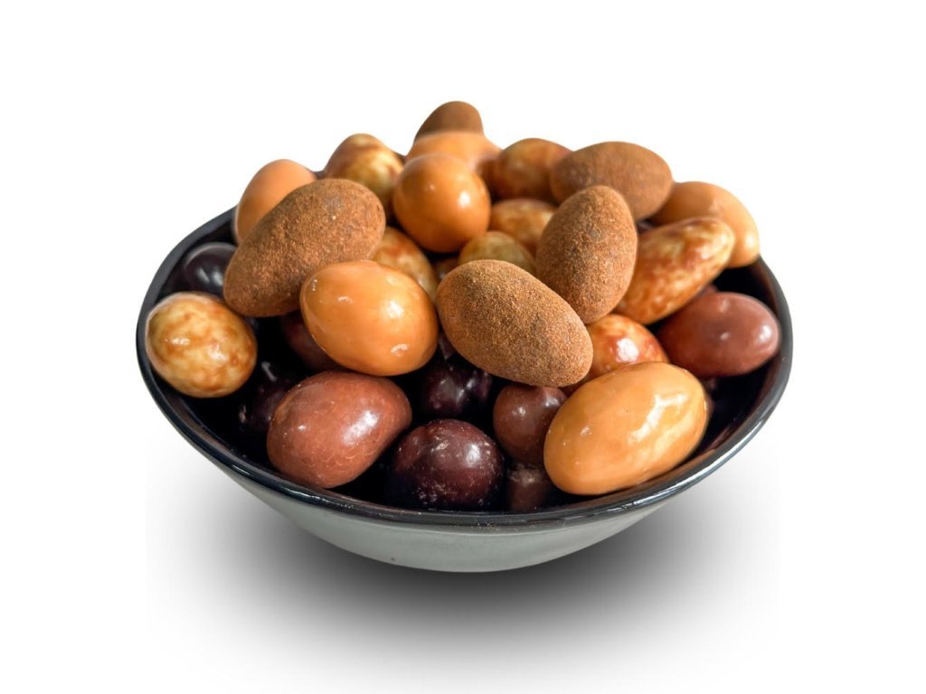| Složení 230 g: | MANDLE V MLÉČNÉ ČOKOLÁDĚ (27 % mandle, mléčná čokoláda (cukr , kakaové máslo, sušené mléko - prášek, kakaová hmota, syrovátkový prášek, laktóza, Leštící složka -E414, Sójový lecitin, přírodní vanilkové aroma); MANDLE V MLÉČNÉ ČOKOLÁDĚ SE SKOŘICÍ (23 % mandle, 76 % mléčná čokoláda (kakaové máslo, sušené mléko - prášek, kakaová hmota, syrovátkový prášek, laktóza, Leštící složka -E414, sójový lecitin, přírodní vanilkové aroma, arašídový olej, skořice); MANDLE V BÍLÉ ČOKOLÁDĚ A SLANÉM KARAMELU (24,75 % mandle, bílá čokoláda (cukr, kakaové máslo, sušené mléko, mléčný cukr, odstředěné sušené mléko, arašídový olej, kakaová hmota, sójový lecitin, vanilkové aroma, mořská sůl, arabská guma, koření, jogurtový prášek, šelak); KEŠU V HOŘKÉ ČOKOLÁDĚ (25 % kešu ořechy, hořká čokoláda (cukr, kakaová hmota, kakaové máslo, leštící složka, sójový lecitin, přírodní vanilkové aroma); KEŠU V MLÉČNÉ ČOKOLÁDĚ (25 % kešu ořechy, mléčná čokoláda (cukr, kakaové máslo, sušené mléko plnotučné, kakaová hmota, sušená syrovátka, mléčný cukr, leštící složka, sójový lecitin, přírodní vanilkové aroma); LÍSKOVÉ OŘECHY V MLÉČNÉ ČOKOLÁDĚ (14 % lískové ořechy, mléčná čokoláda (cukr, kakaová hmota, kakaové máslo, sušené mléko, sušená syrovátka, laktóza, sójový lecitin, vanilkové aroma, leštící složka - arabská guma). |