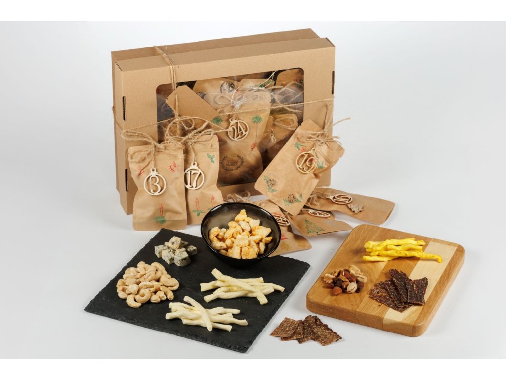 Adventní kalendář s lyofilizovanými sýry, sušeným BIO hovězím masem a BIO oříšky