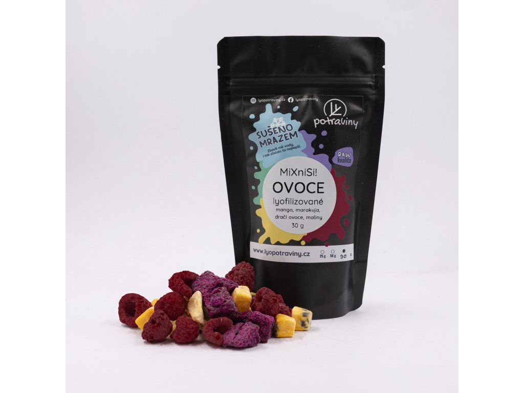 | Složení 30 g: | lyofilizováno: 10 g marakuja, 10 g dračí ovoce, 5 g mango, 5 g maliny |