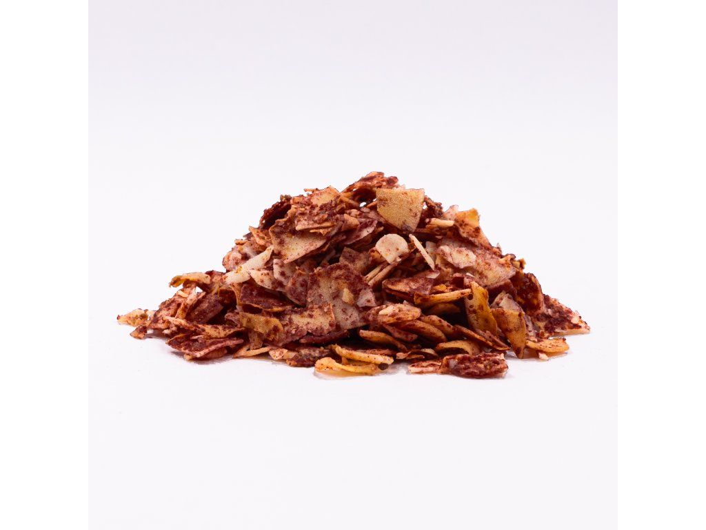 Zakousněte se do krásně křupavého kokosu, který je doplněn o tenké plátky mandlí. Ještě horká směs je obalena v lyofilizovaných malinách.
