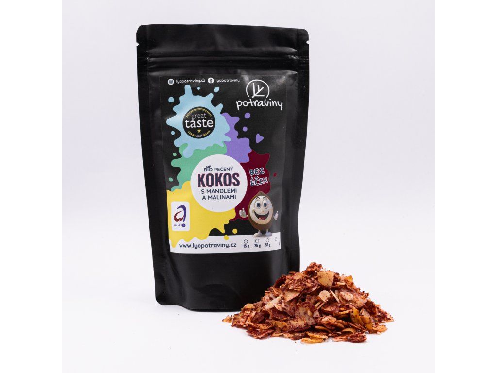 | Složení: | 53 % BIO kokosové chipsy, 27 % BIO mandlové plátky, BIO kokosový olej, BIO kokosový cukr, 5 % lyofilizované maliny |