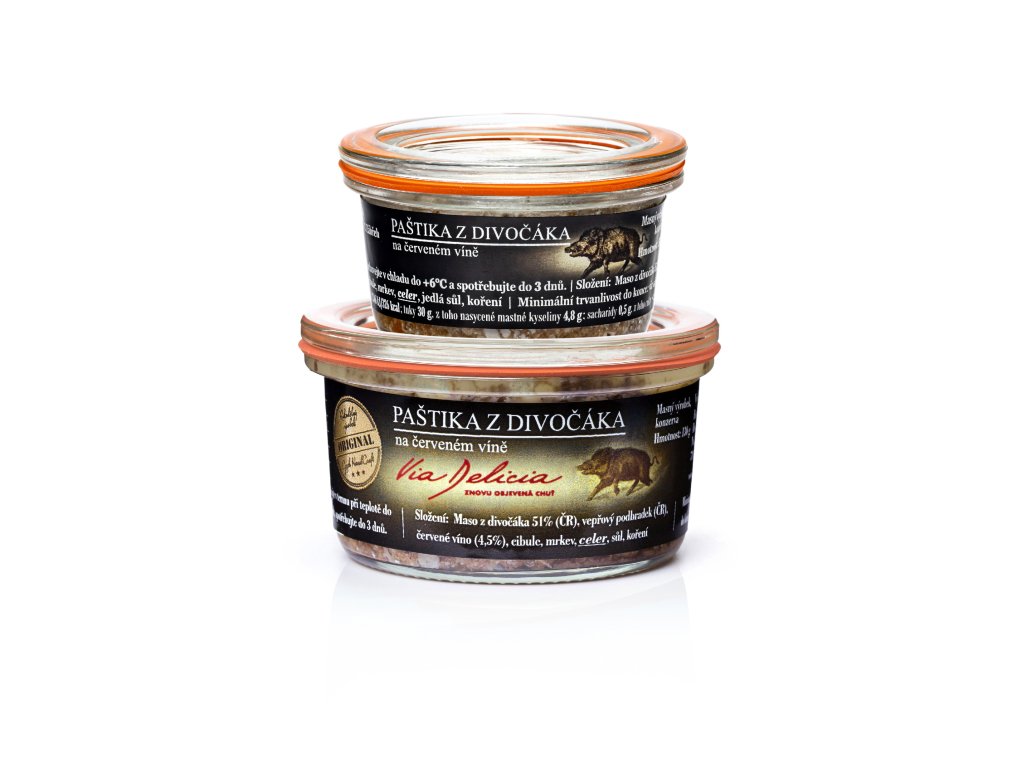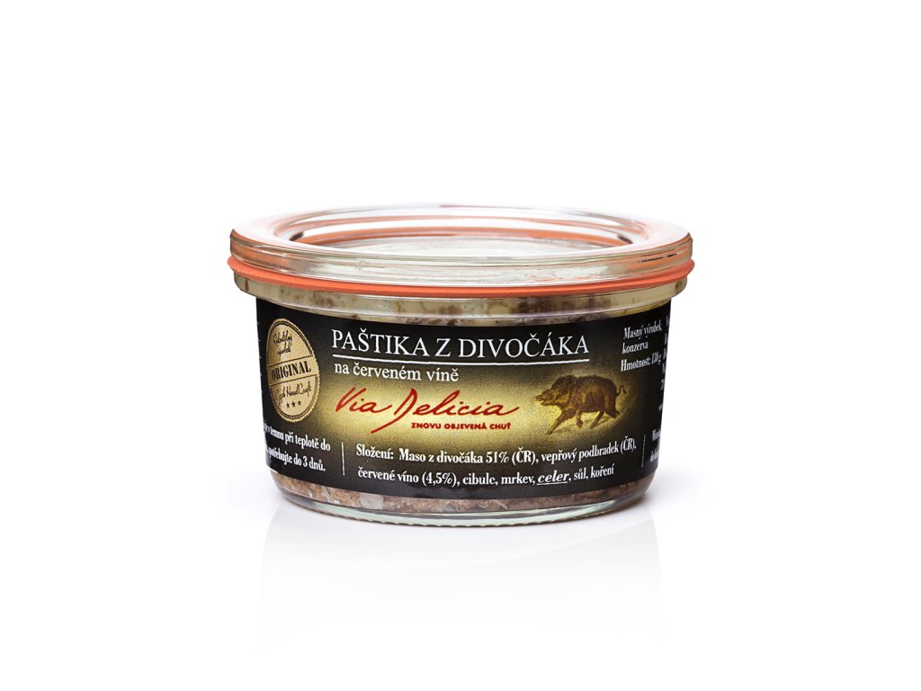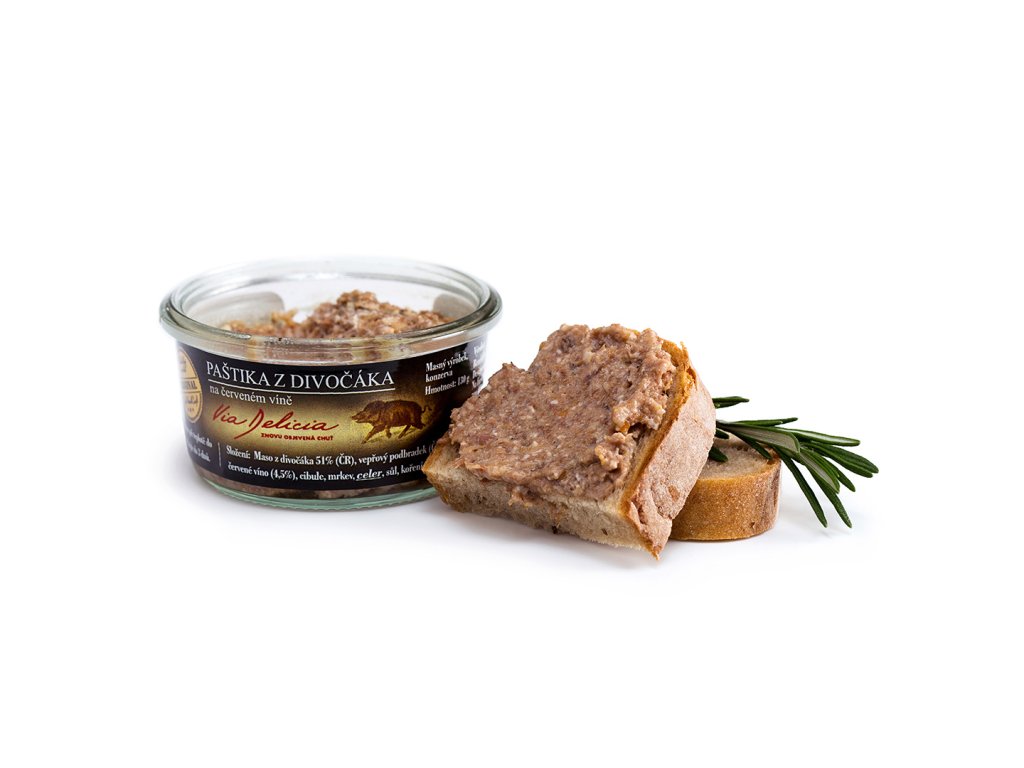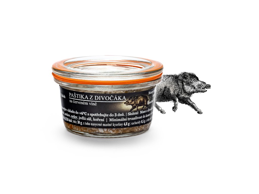 Pravá zvěřinová paštika z divočáka, která se stala v poslední době naším bestsellerem. Paštika je provoněná divokým kořením a jalovcem a je dobře roztíratelná. Zamiluje si jí snad každý milovník masa.