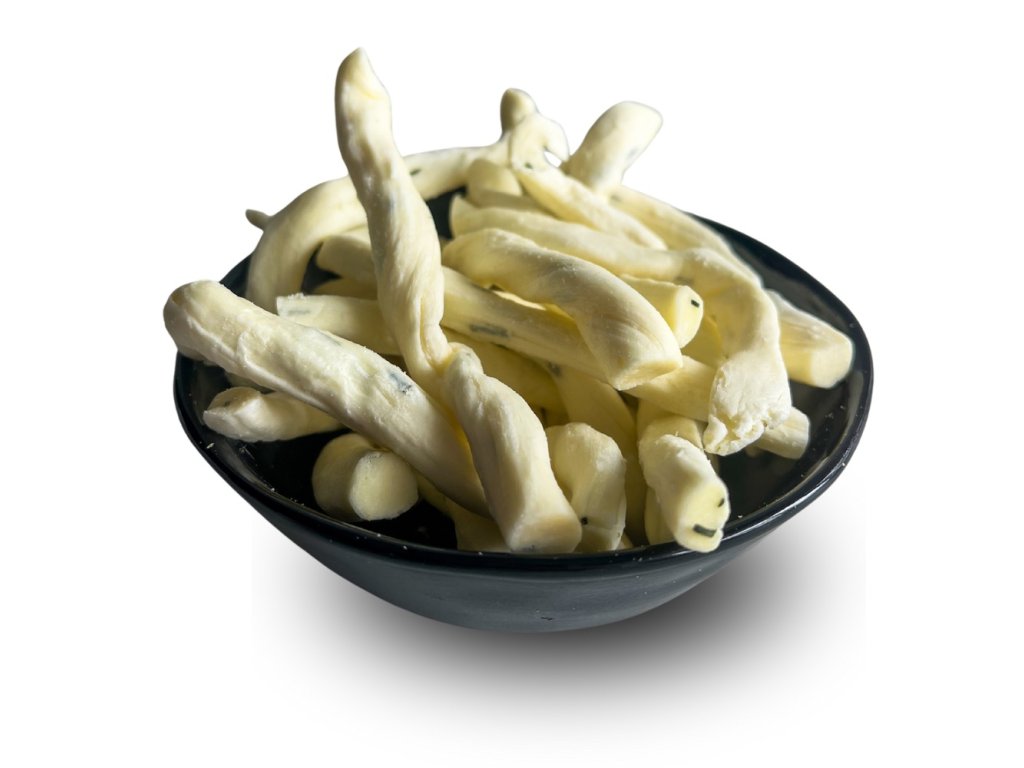 Lyofilizované přírodní pařené nitě - pažitka. Nitě jsou lahodnou pochoutkou, kterou si zamilujete. S délkou cca 12 cm jsou ideální nejen pro děti, ale také pro všechny, kdo ocení kvalitní chuť přírodního sýru. Nitě jsou skvělým doplňkem k vínu a můžete je využít i jako lahodný zpestření různých dipů.