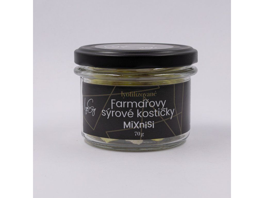 Sýrové kostičky vyrábíme z kvalitního farmářského sýra. Po nakrájení procházejí procesem sušení mrazem – lyofilizací. Ta probíhá při nízkých teplotách a tlaku, kdy se voda ze sýra odstraňuje šetrně, aniž by došlo k výrazné ztrátě chuti.