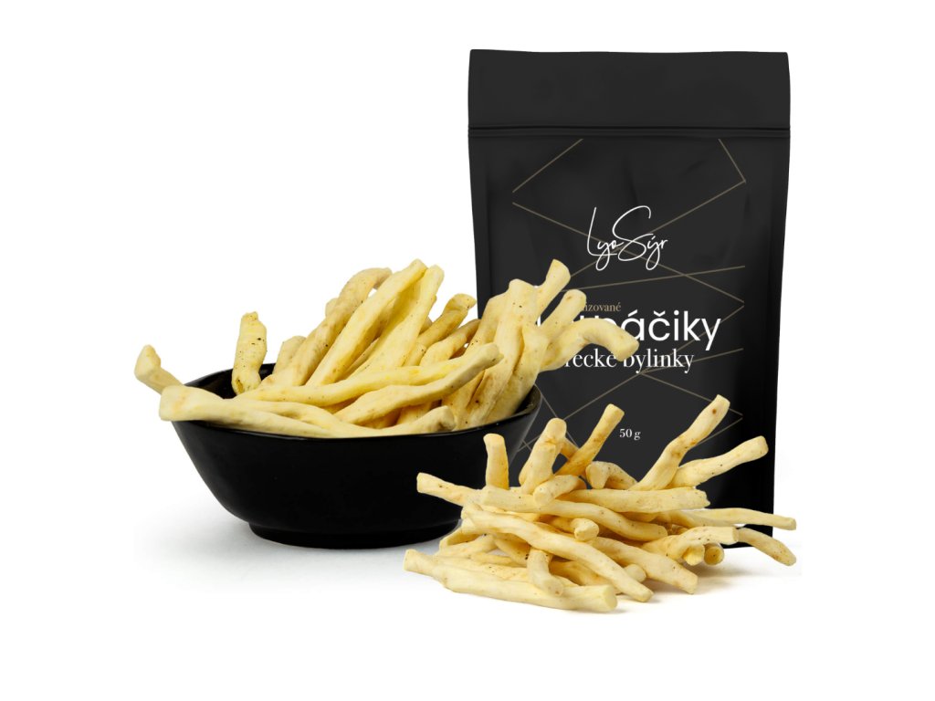 Lyofilizované přírodní pařené nitě - řecké bylinky. Představujeme jedinečné nitě, které jsou dokonalou svačinkou a zaručí vám skvělý gastronomický zážitek. S délkou cca 12 cm jsou ideální nejen pro děti, ale také pro ty, kteří si rádi pochutnají na dobrém sýru. Nitě jsou skvělým doplňkem k vínu a můžete je použít i k namáčení do různých dipů.