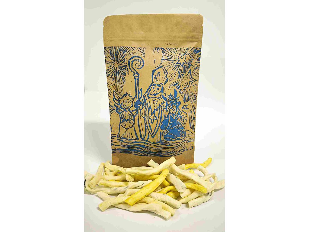 Do mikulášského balíčku jsme zabalili 140 g všech druhů korbáčiků, které vyrábíme. Balíček je nazdoben ručním tiskem linorytu, který pro Vás vyrobila Lenka Grmelová, moje maminka. Každý pytlík je naplněn až po okraj sýry, které pochází výhradně z ČR a jsou vyráběny v Doubravském dvoře.